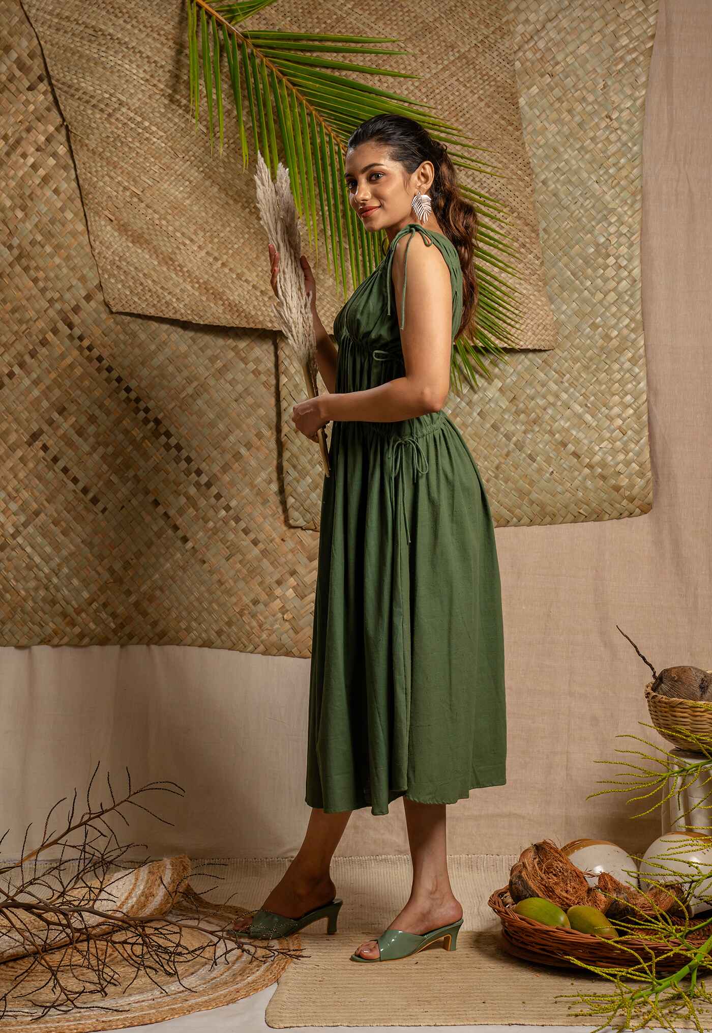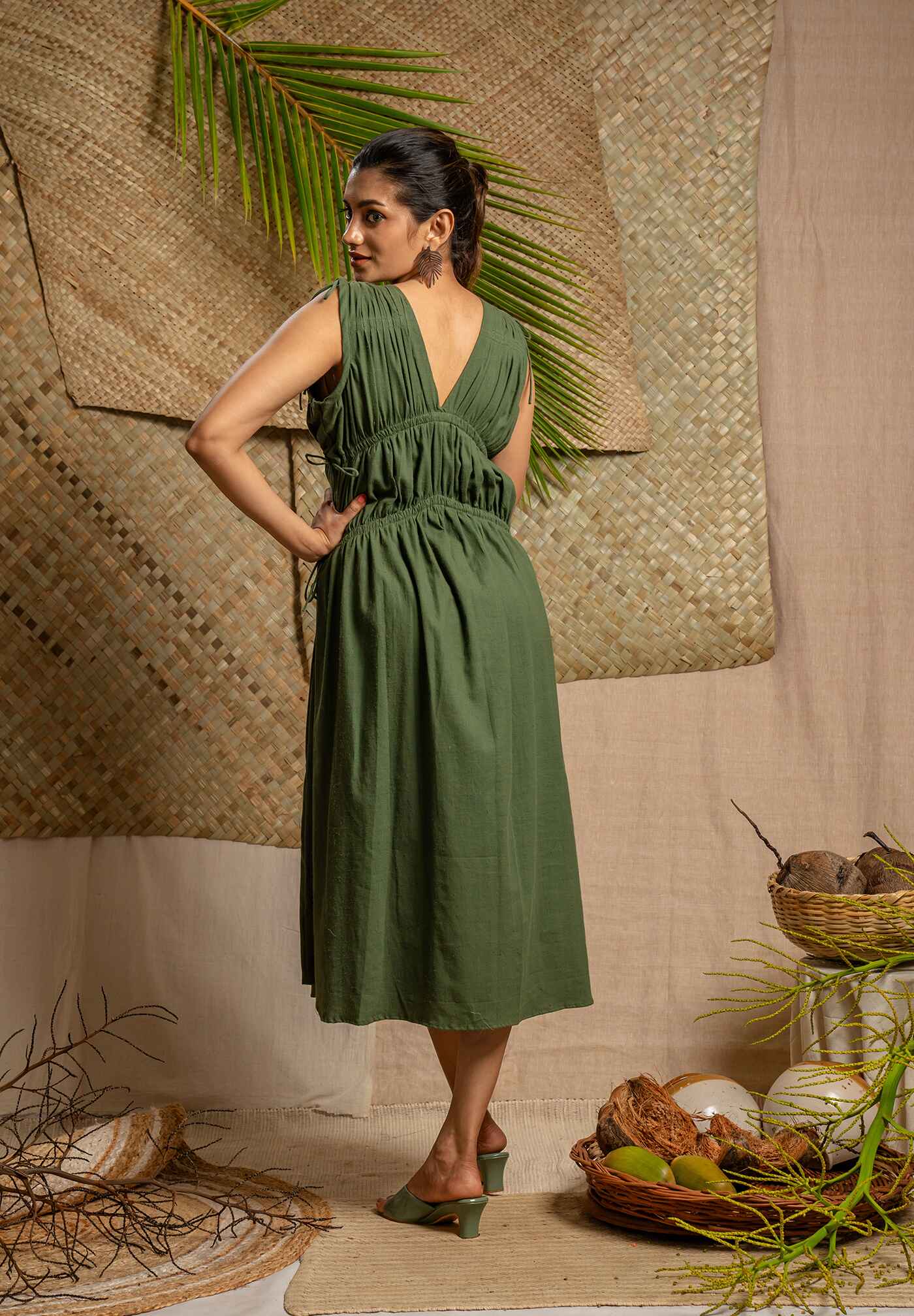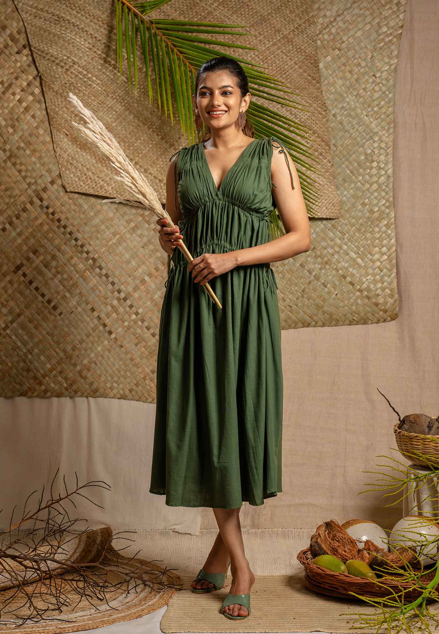 Elegant mid calf length green dress with adjustable tie details at bust and waist featuring a flowy silhouette and V neck line