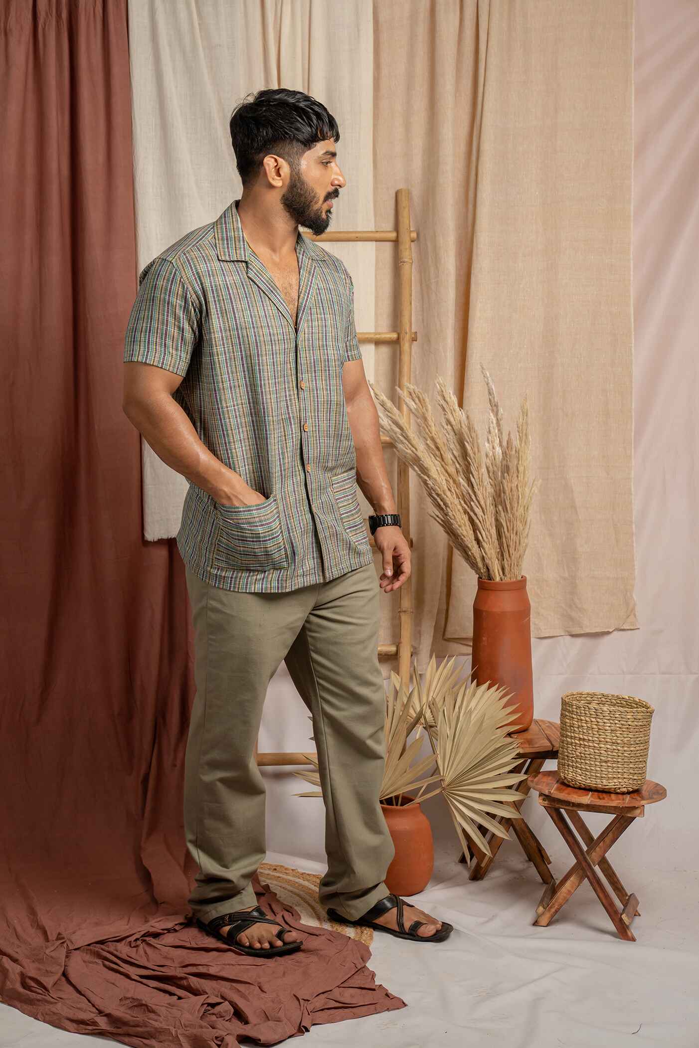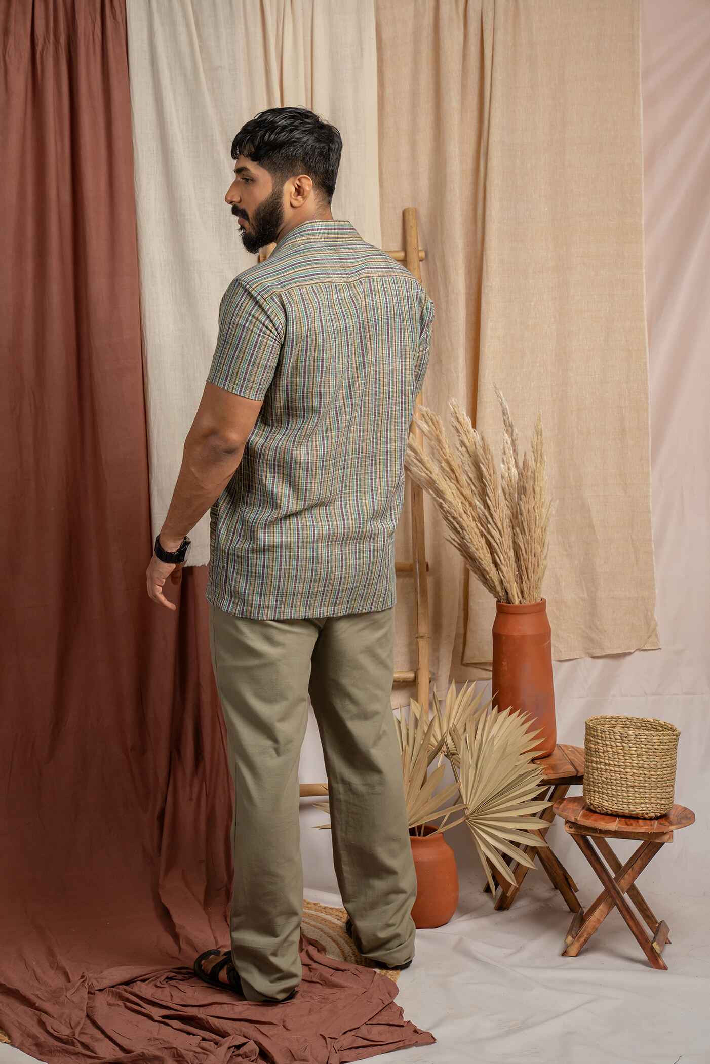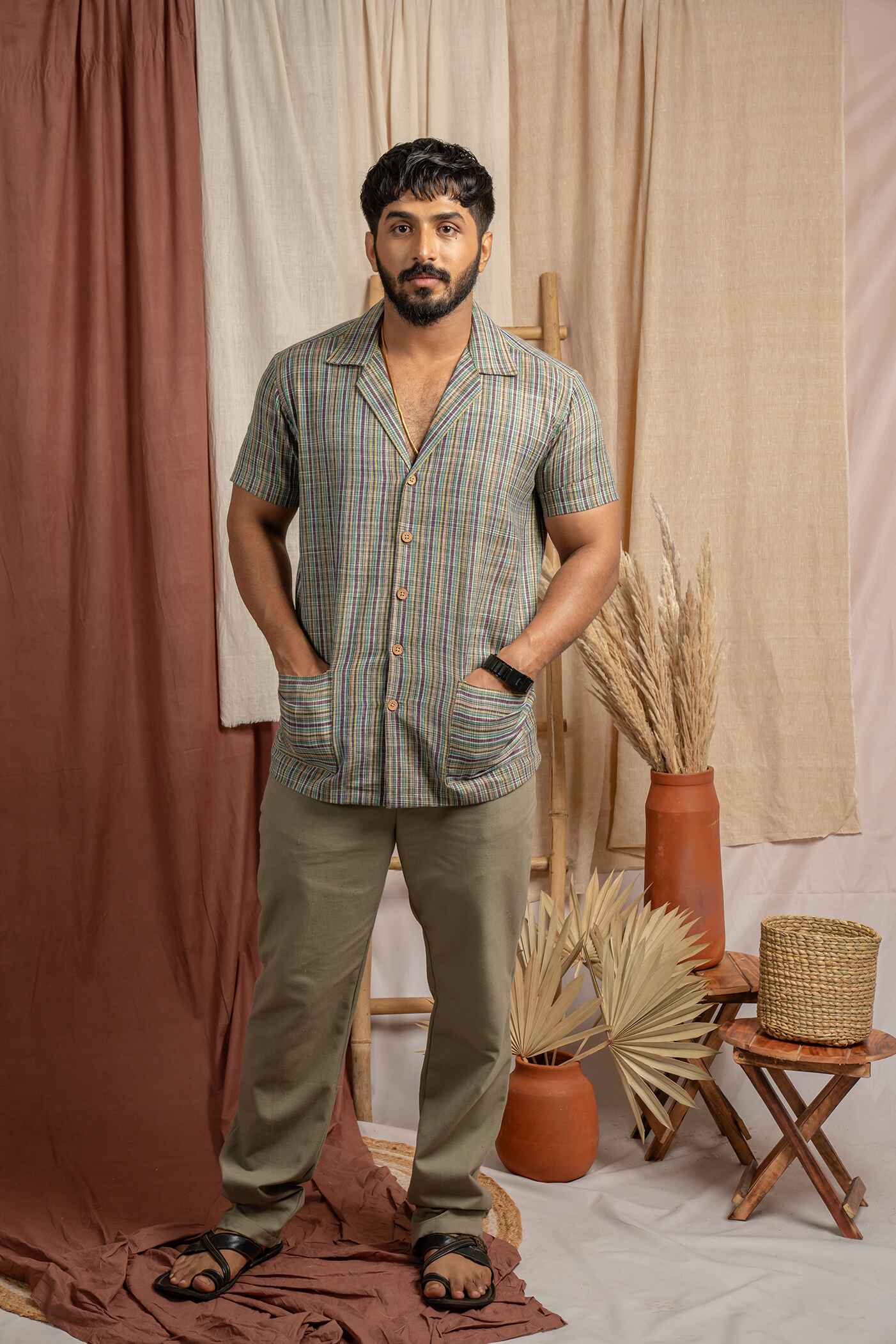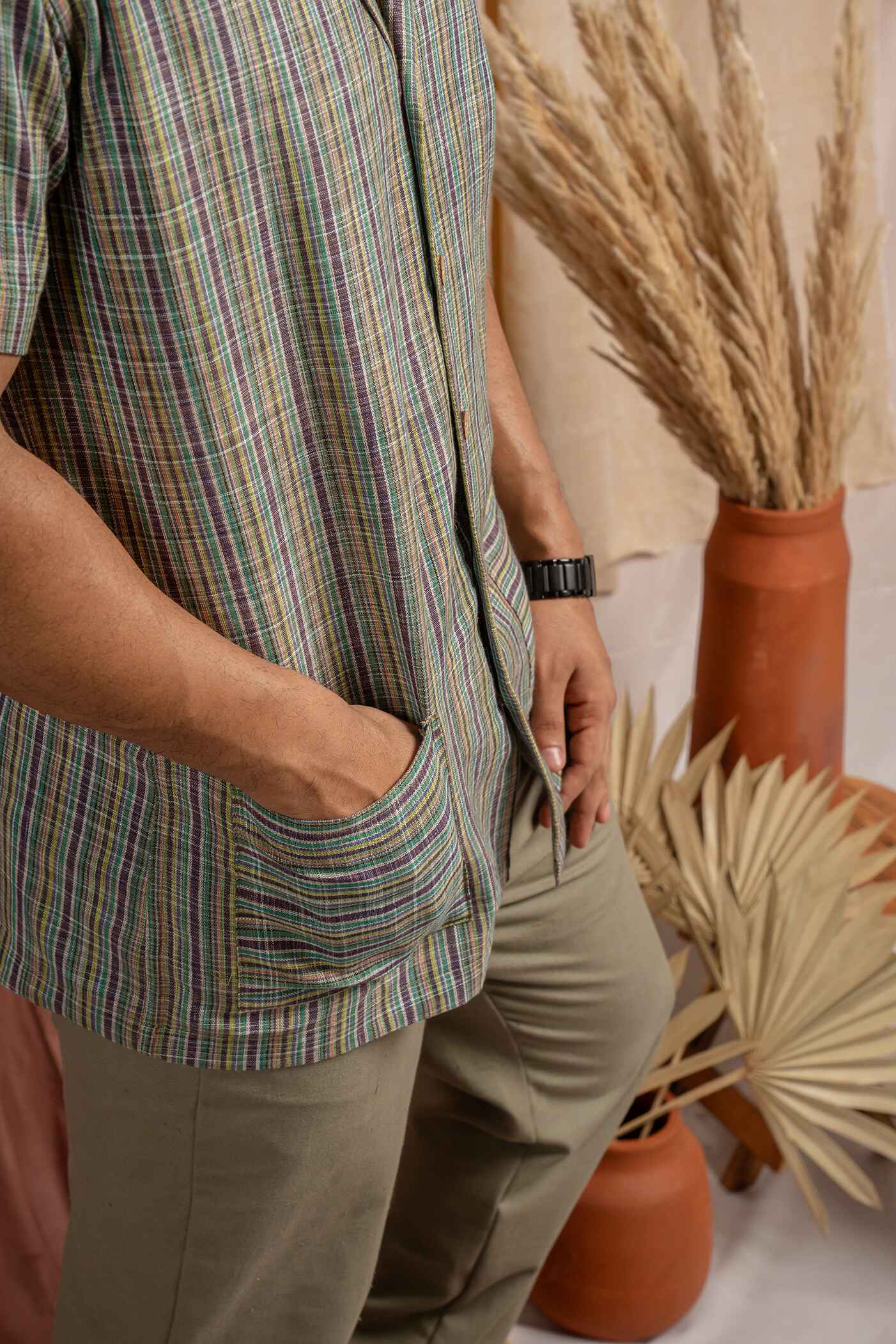 Green Stripped lapel collared half sleeve Khadi cotton shirt with double pocket detailing at front.