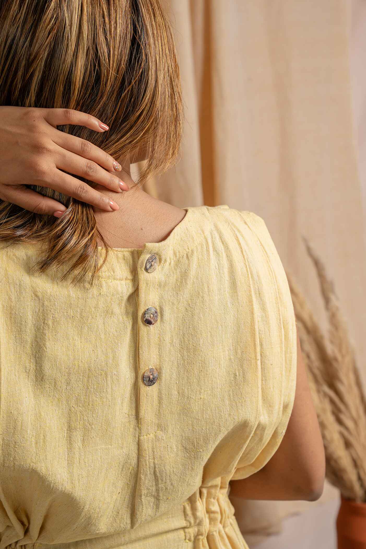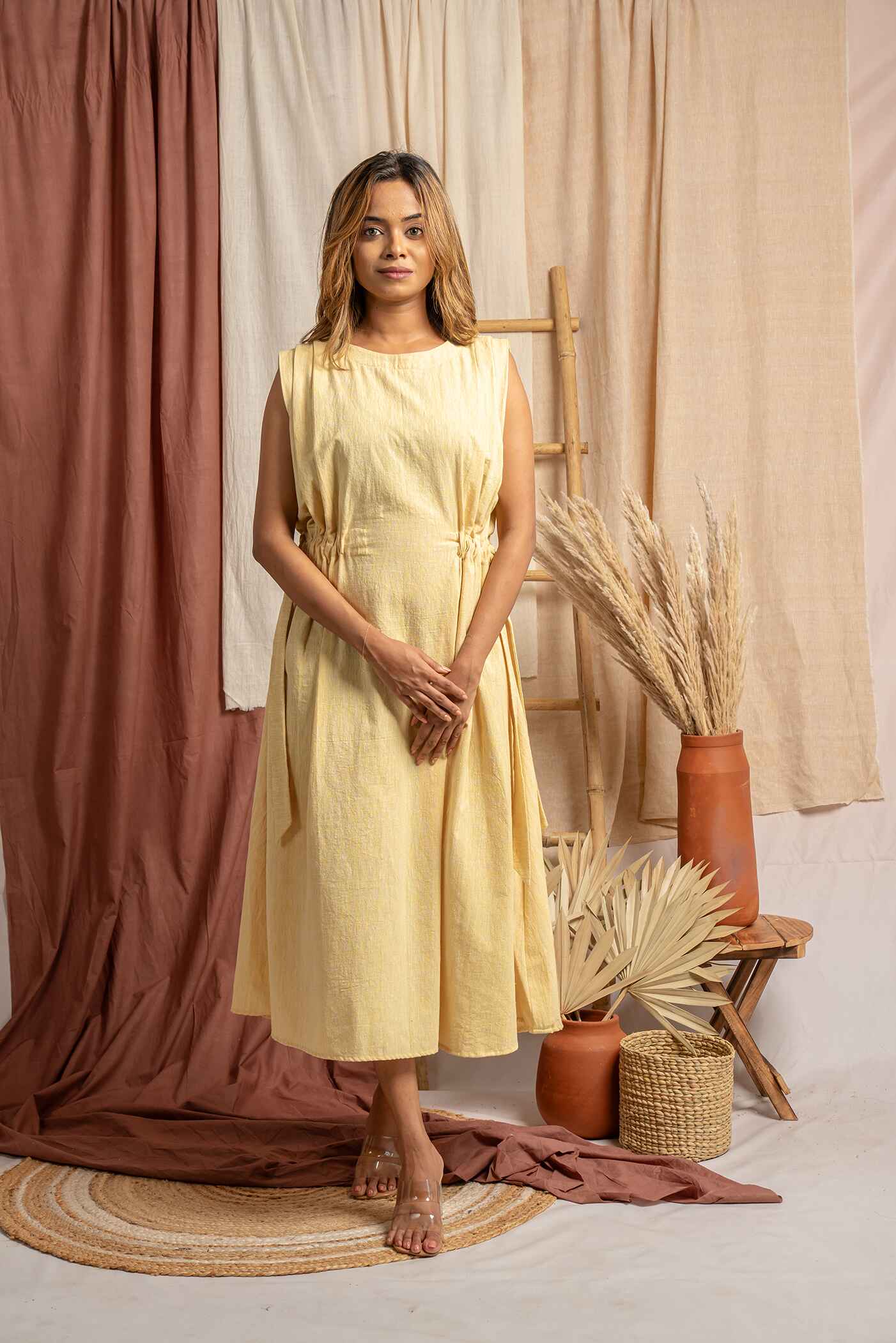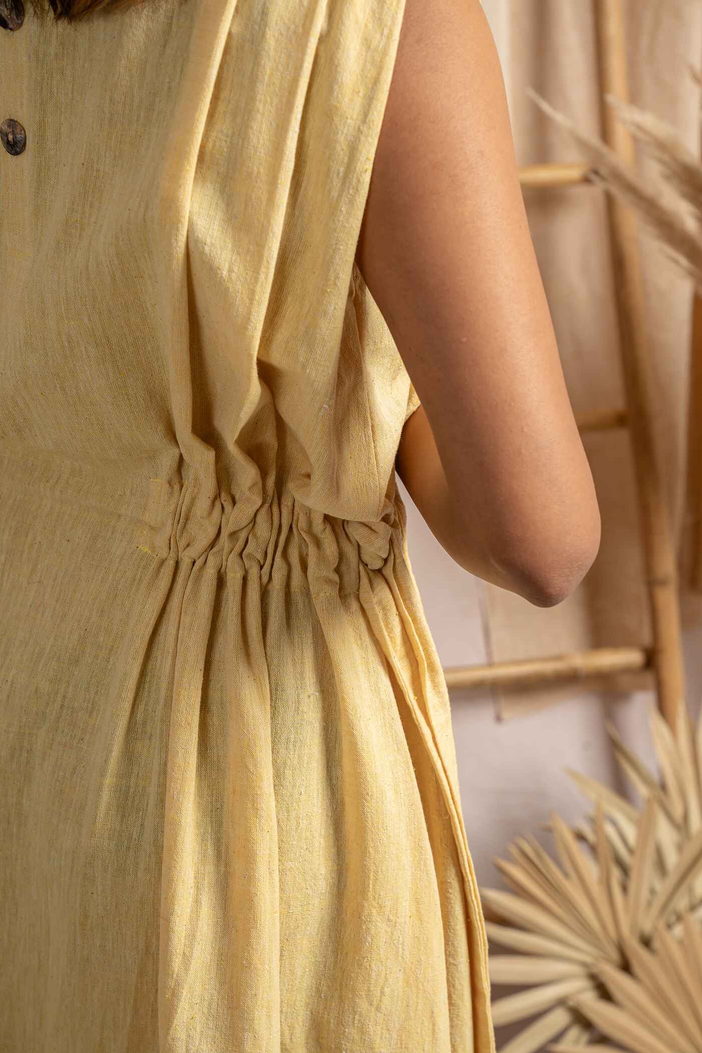 Mid-calf length yellow Khadi dresss with Tie detail at waist and pleats at shoulder