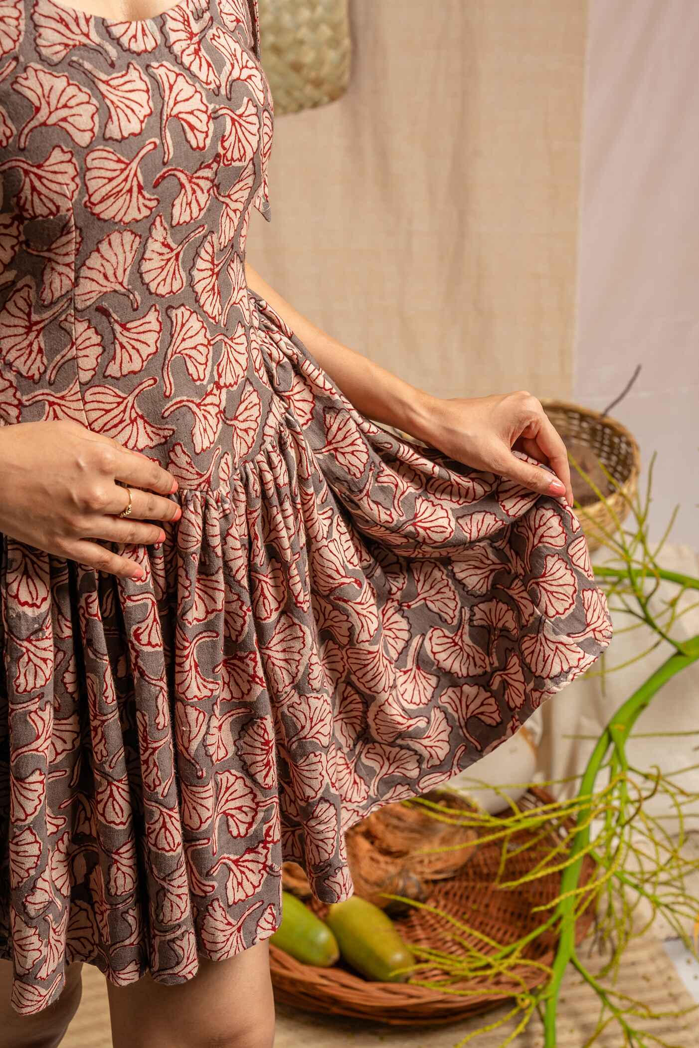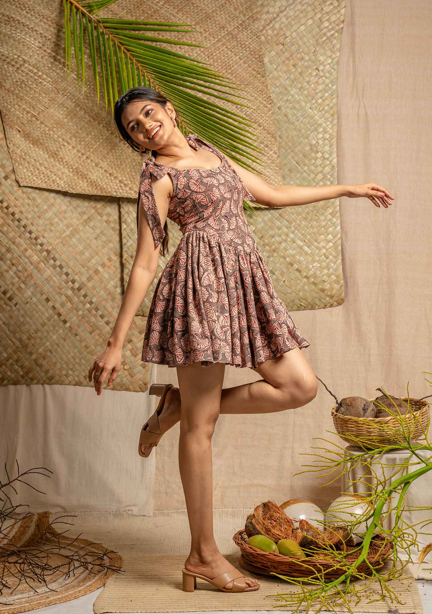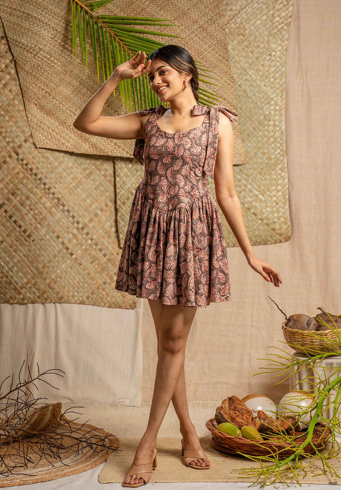 Hand block printed fit at flare mini dress with adjustable tie detail at shoulder and zipper closure at back.