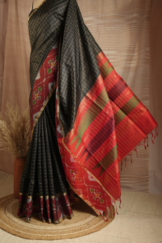 Khadi Tussar silk saree with gold check pattern on the body, intricate ikkat weave border and a bold red pallu.