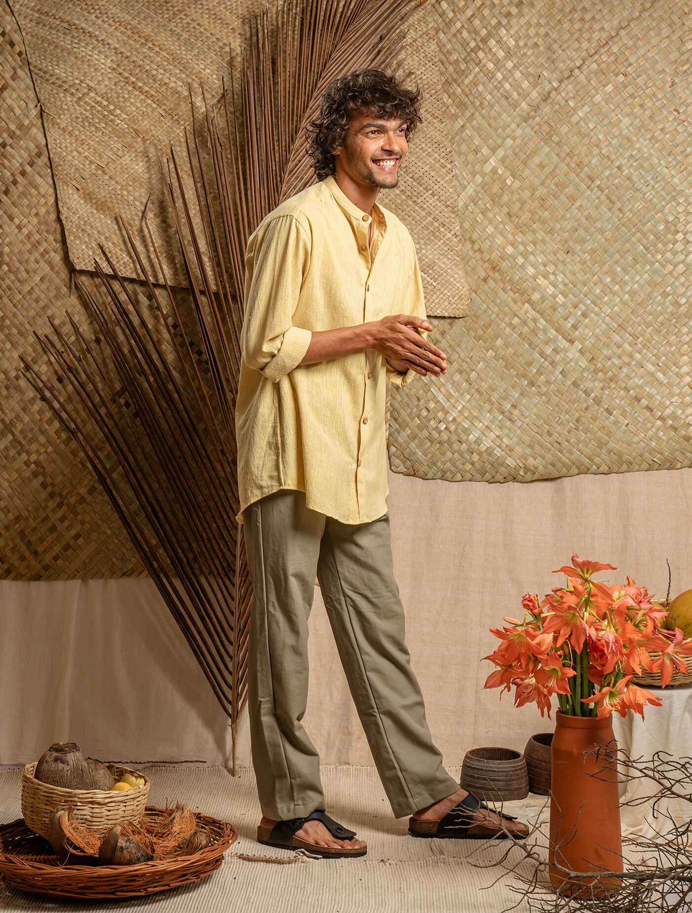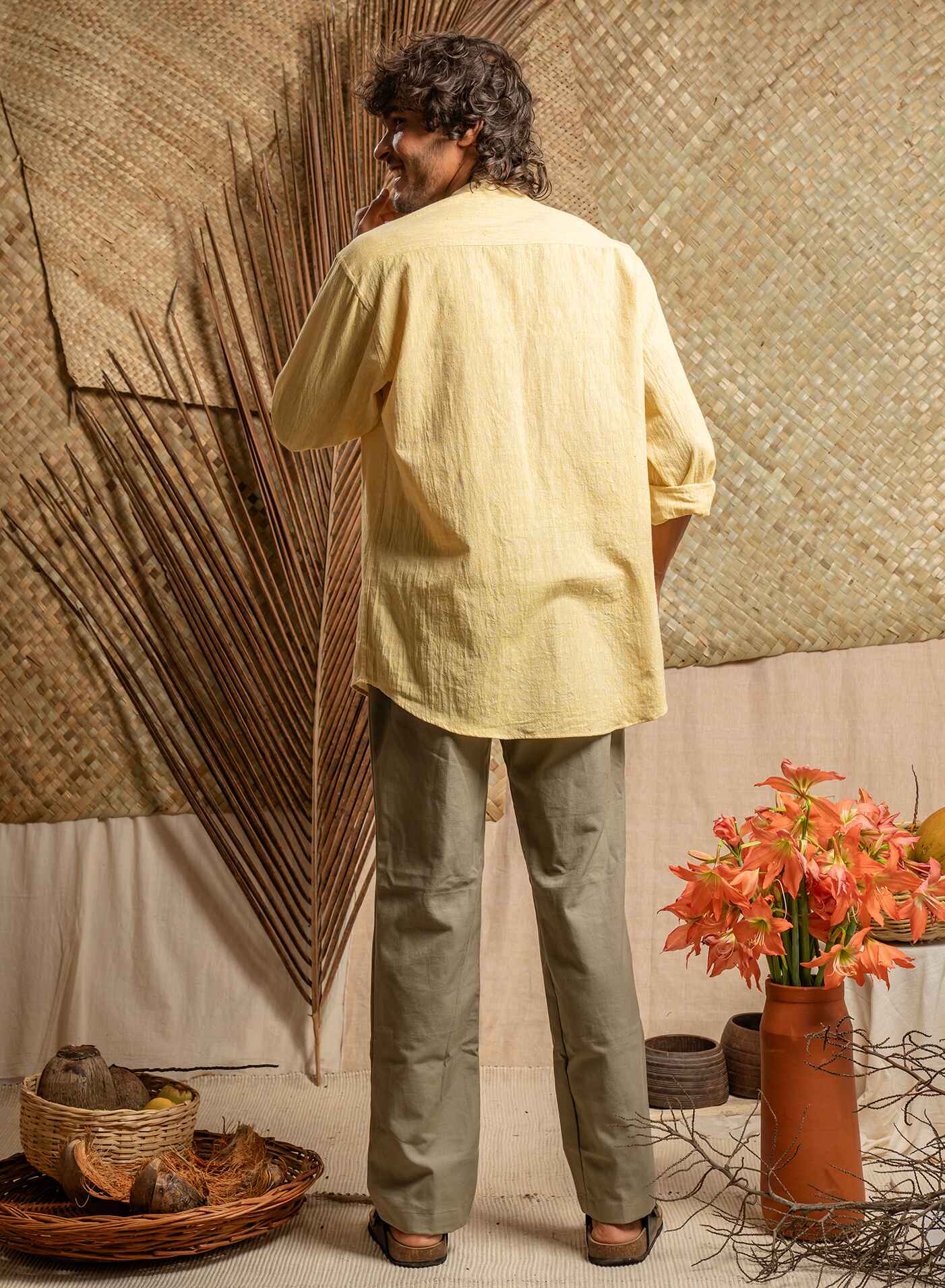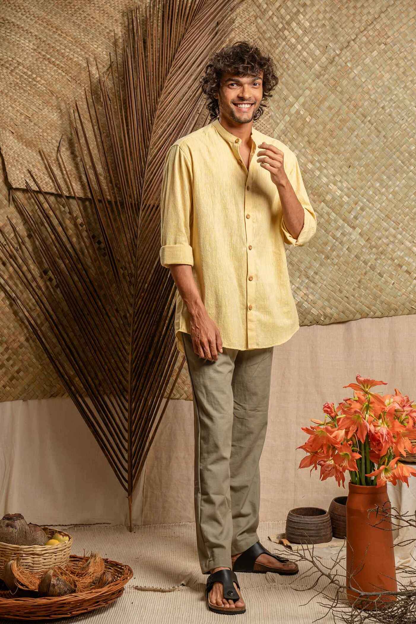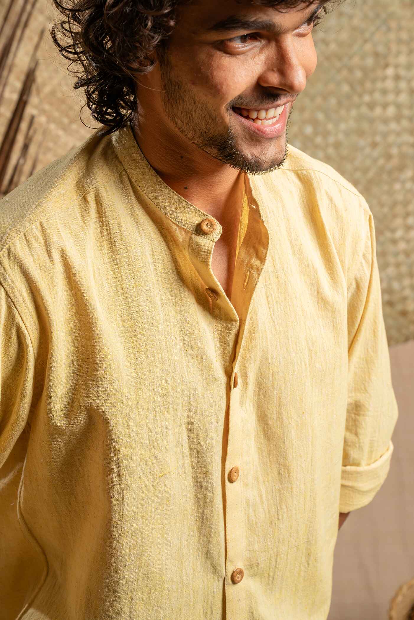 Pale yellow khadi cotton shirt with Mandarin collar and full sleeves