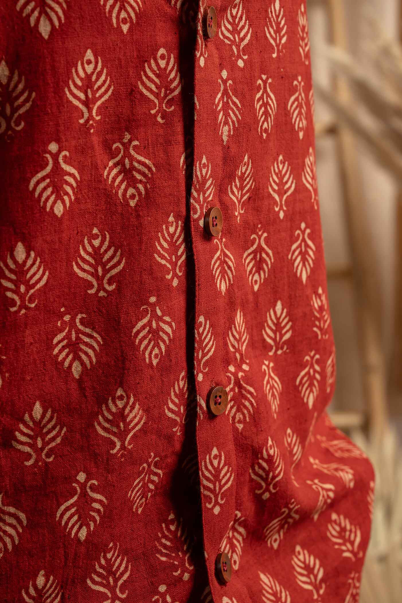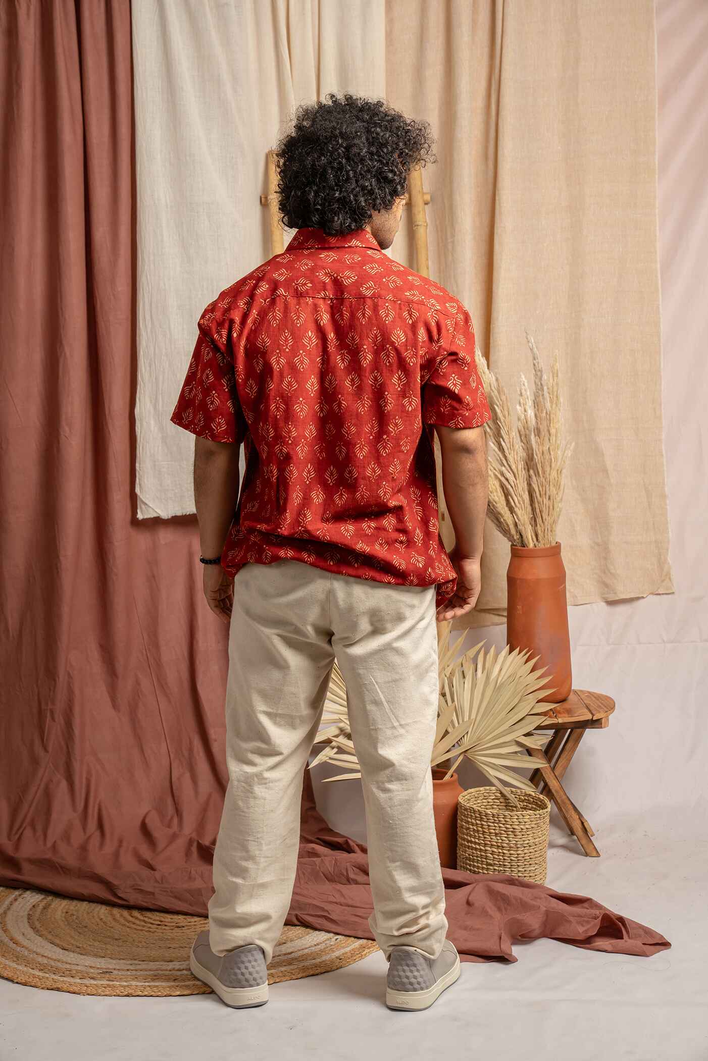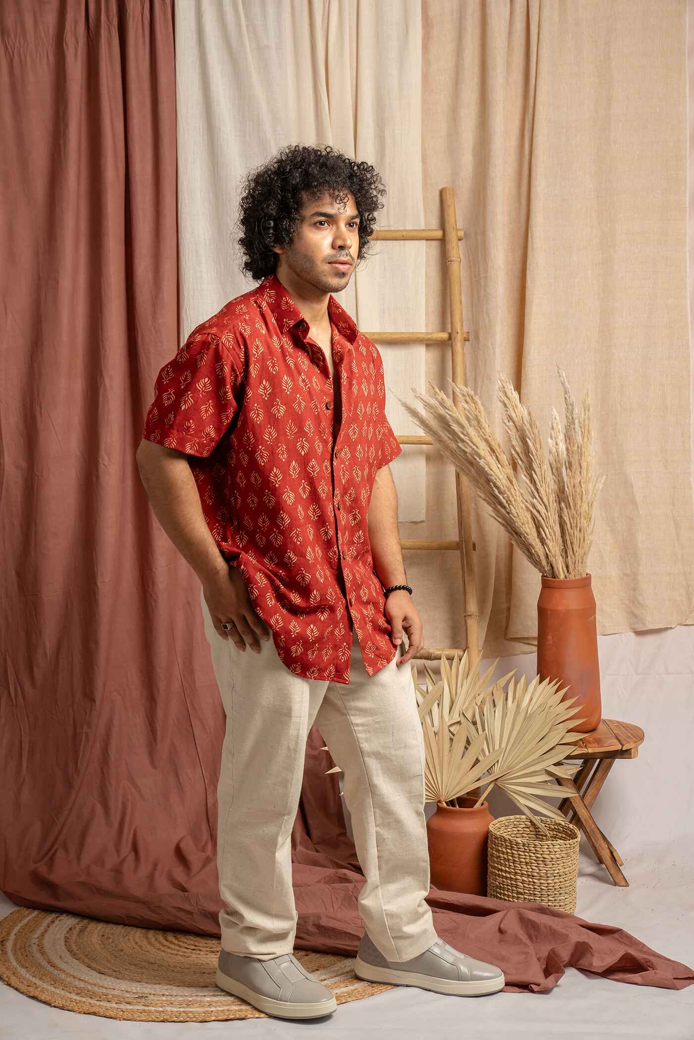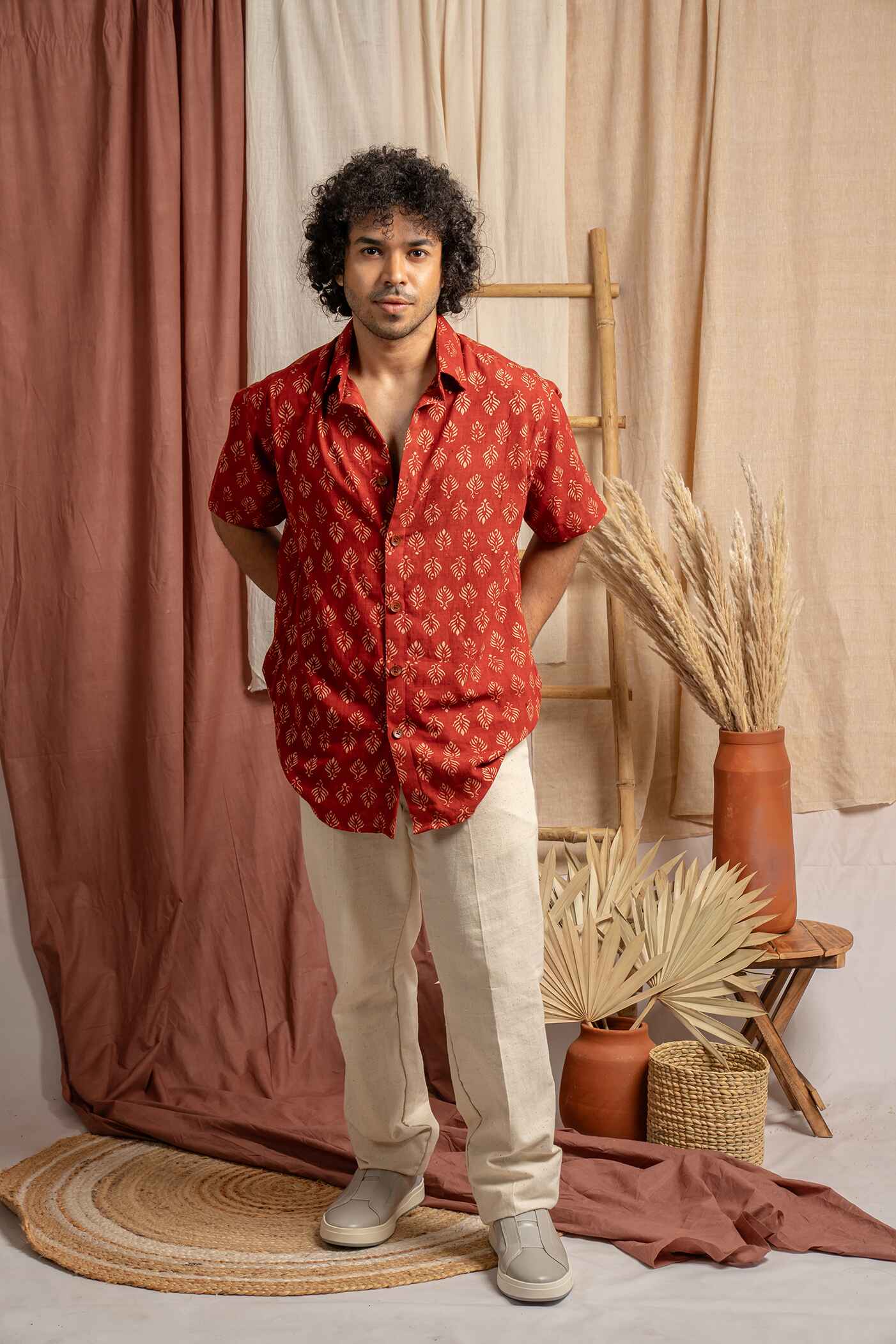 Ajrakh hand block printed khadi cotton shirt with classic collar and half sleeves